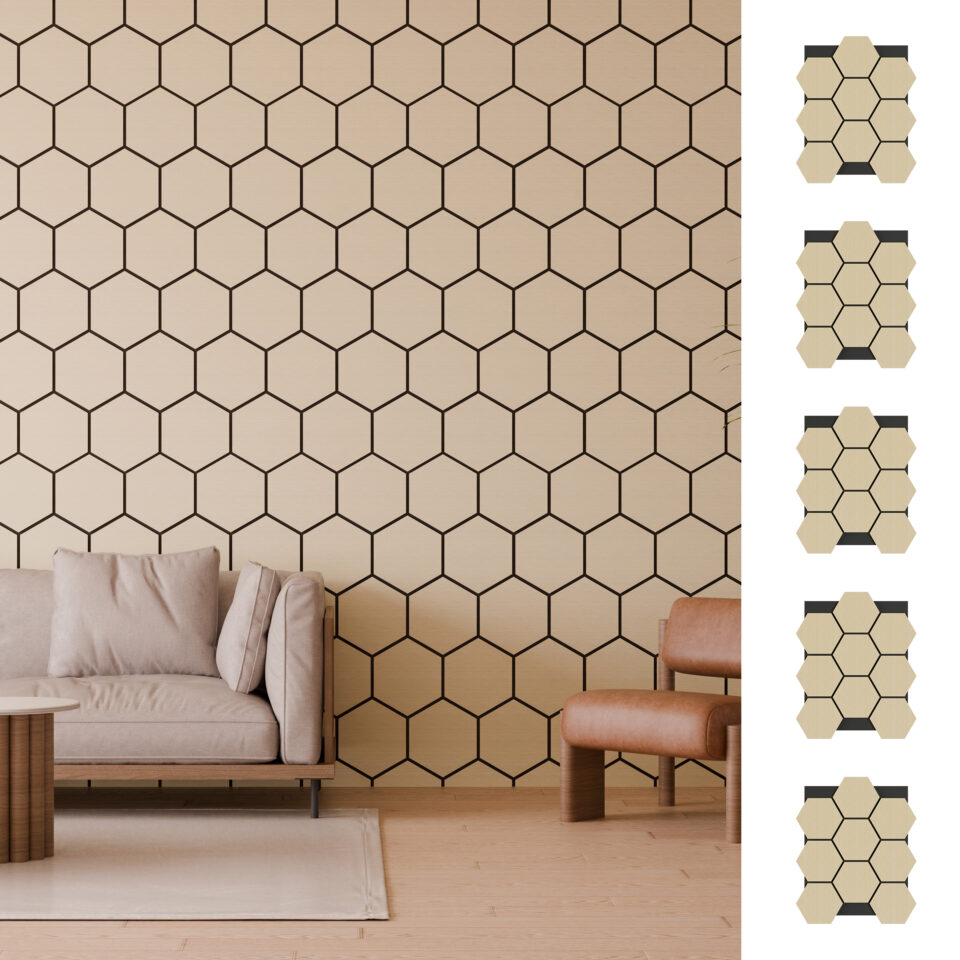 - Matériaux : feutrine acoustique noire recyclée + lattes MDF plaquées chêne
